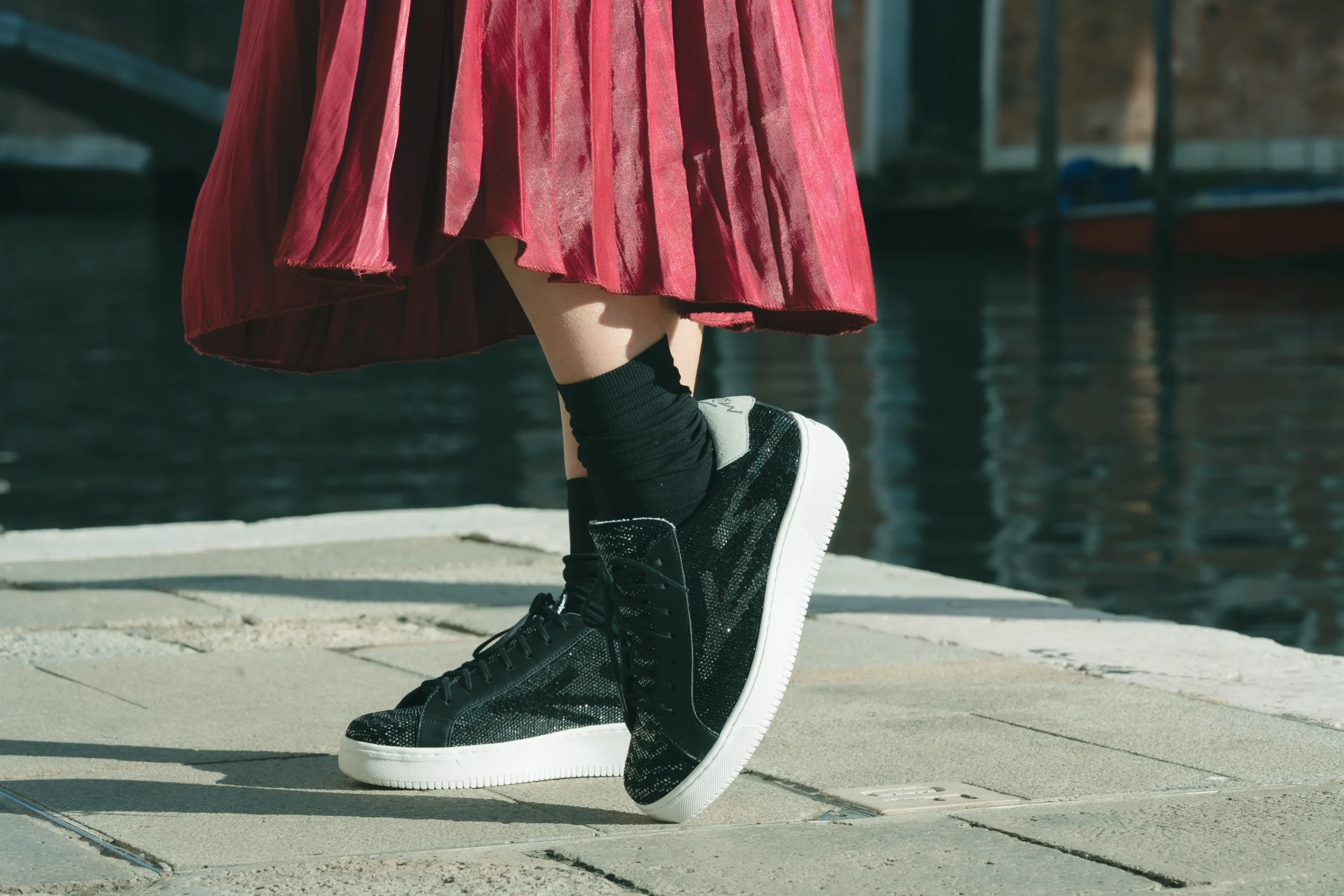 Un modello dedicato alle amanti dell’eleganza luminosa, in cui abbiamo potuto esprimere pienamente l’esperienza di anni maturata nella tecnica di applicazione degli strass. Un dettaglio unico, la linguetta con la fusione dei due colori dominanti, ma invertiti. In questa scarpa, c’è tutto il nostro mondo.
